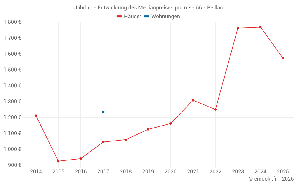 Der Durchschnittspreis auf den 29 Hausgeschäften der letzten 12 Monate in der Gemeinde Peillac betrug 1 725 € pro Quadratmeter für einen mittleren Immobilienwert von 147 000 €. Über diesen Zeitraum hinweg lagen 60% der Transaktionen zwischen 1 299 und 1 998 € pro Quadratmeter (vom 2. bis zum 8. Dezil).