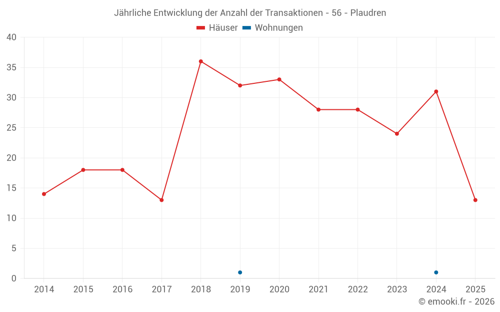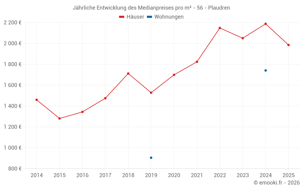 Der Durchschnittspreis auf den 32 Hausgeschäften der letzten 12 Monate in der Gemeinde Plaudren betrug 1 970 € pro Quadratmeter für einen mittleren Immobilienwert von 197 500 €. Über diesen Zeitraum hinweg lagen 60% der Transaktionen zwischen 1 323 und 2 446 € pro Quadratmeter (vom 2. bis zum 8. Dezil).