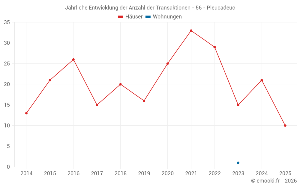 Der Durchschnittspreis auf den 23 Hausgeschäften der letzten 12 Monate in der Gemeinde Pleucadeuc betrug 2 118 € pro Quadratmeter für einen mittleren Immobilienwert von 233 000 €. Über diesen Zeitraum hinweg lagen 60% der Transaktionen zwischen 1 464 und 2 477 € pro Quadratmeter (vom 2. bis zum 8. Dezil).