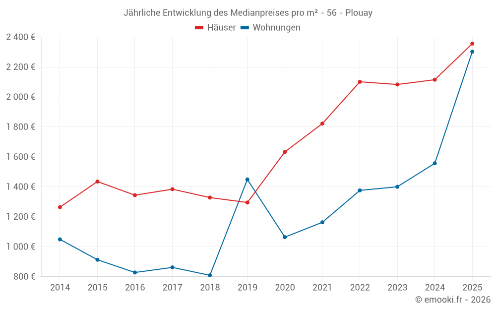 Der Durchschnittspreis auf den 28 Hausgeschäften der letzten 6 Monate in der Gemeinde Plouay betrug 2 356 € pro Quadratmeter für einen mittleren Immobilienwert von 225 000 €. Über diesen Zeitraum hinweg lagen 60% der Transaktionen zwischen 1 905 und 2 842 € pro Quadratmeter (vom 2. bis zum 8. Dezil).