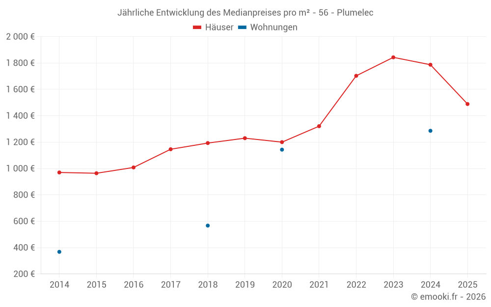 Der Durchschnittspreis auf den 25 Hausgeschäften der letzten 12 Monate in der Gemeinde Plumelec betrug 1 667 € pro Quadratmeter für einen mittleren Immobilienwert von 176 000 €. Über diesen Zeitraum hinweg lagen 60% der Transaktionen zwischen 845 und 1 998 € pro Quadratmeter (vom 2. bis zum 8. Dezil).
