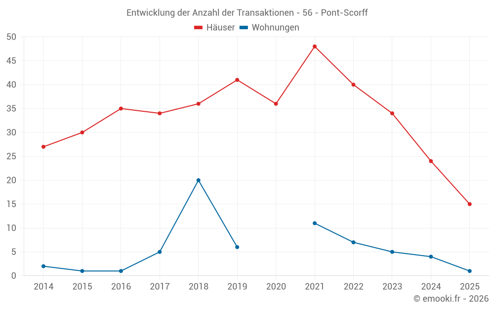 Der Durchschnittspreis auf den 28 Hausgeschäften der letzten 12 Monate in der Gemeinde Pont-Scorff betrug 2 762 € pro Quadratmeter für einen mittleren Immobilienwert von 275 000 €. Über diesen Zeitraum hinweg lagen 60% der Transaktionen zwischen 1 933 und 3 109 € pro Quadratmeter (vom 2. bis zum 8. Dezil).