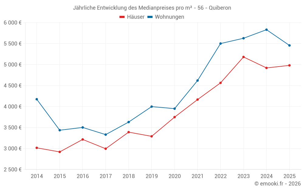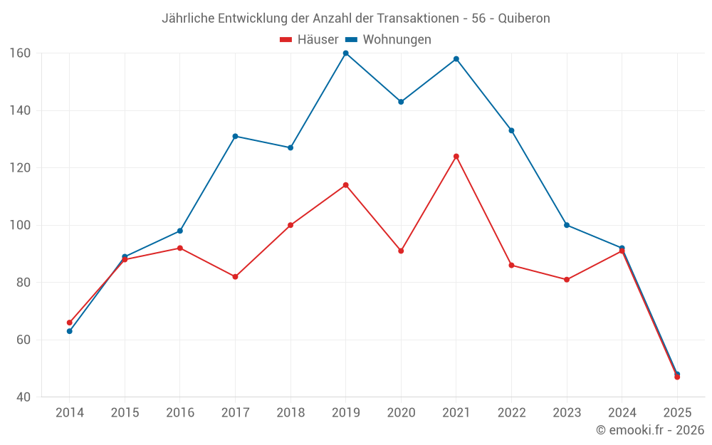 Der Durchschnittspreis auf den 28 Hausgeschäften der letzten 3 Monate in der Gemeinde Quiberon betrug 4 960 € pro Quadratmeter für einen mittleren Immobilienwert von 437 925 €. Über diesen Zeitraum hinweg lagen 60% der Transaktionen zwischen 3 516 und 6 210 € pro Quadratmeter (vom 2. bis zum 8. Dezil).