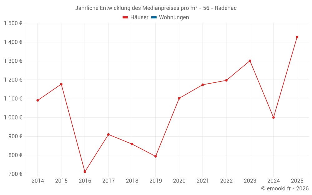 Der Durchschnittspreis auf den 21 Hausgeschäften der letzten 12 Monate in der Gemeinde Radenac betrug 1 381 € pro Quadratmeter für einen mittleren Immobilienwert von 107 500 €. Über diesen Zeitraum hinweg lagen 60% der Transaktionen zwischen 712 und 1 941 € pro Quadratmeter (vom 2. bis zum 8. Dezil).