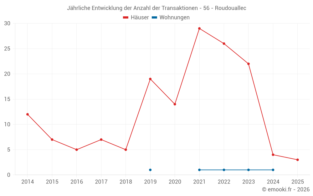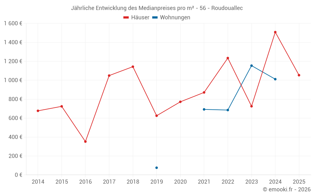Der Durchschnittspreis auf den 19 Hausgeschäften der letzten 24 Monate in der Gemeinde Roudouallec betrug 1 271 € pro Quadratmeter für einen mittleren Immobilienwert von 102 000 €. Über diesen Zeitraum hinweg lagen 60% der Transaktionen zwischen 545 und 1 496 € pro Quadratmeter (vom 2. bis zum 8. Dezil).