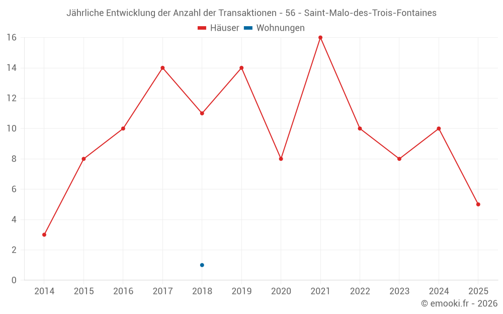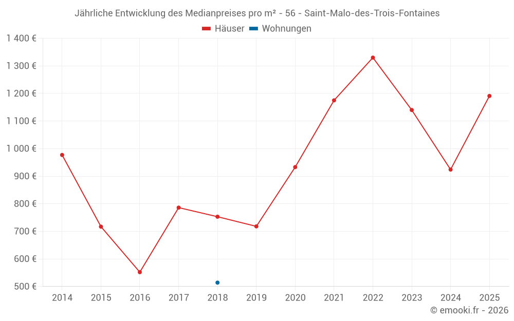 Der Durchschnittspreis auf den 22 Hausgeschäften der letzten 24 Monate in der Gemeinde Saint-Malo-des-Trois-Fontaines betrug 1 014 € pro Quadratmeter für einen mittleren Immobilienwert von 80 000 €. Über diesen Zeitraum hinweg lagen 60% der Transaktionen zwischen 472 und 1 353 € pro Quadratmeter (vom 2. bis zum 8. Dezil).
