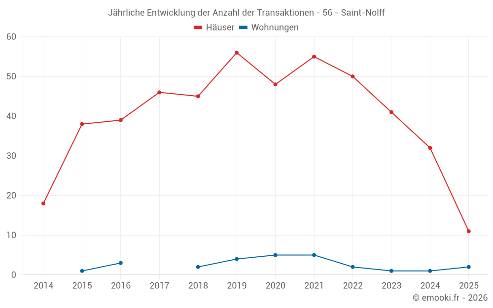 Der Durchschnittspreis auf den 32 Hausgeschäften der letzten 12 Monate in der Gemeinde Saint-Nolff betrug 2 727 € pro Quadratmeter für einen mittleren Immobilienwert von 281 243 €. Über diesen Zeitraum hinweg lagen 60% der Transaktionen zwischen 2 147 und 3 360 € pro Quadratmeter (vom 2. bis zum 8. Dezil).