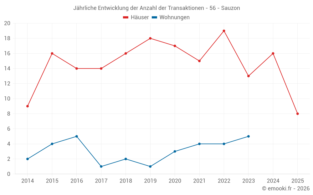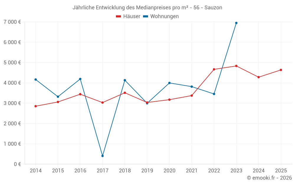 Der Durchschnittspreis auf den 18 Hausgeschäften der letzten 12 Monate in der Gemeinde Sauzon betrug 4 374 € pro Quadratmeter für einen mittleren Immobilienwert von 370 000 €. Über diesen Zeitraum hinweg lagen 60% der Transaktionen zwischen 2 091 und 5 124 € pro Quadratmeter (vom 2. bis zum 8. Dezil).