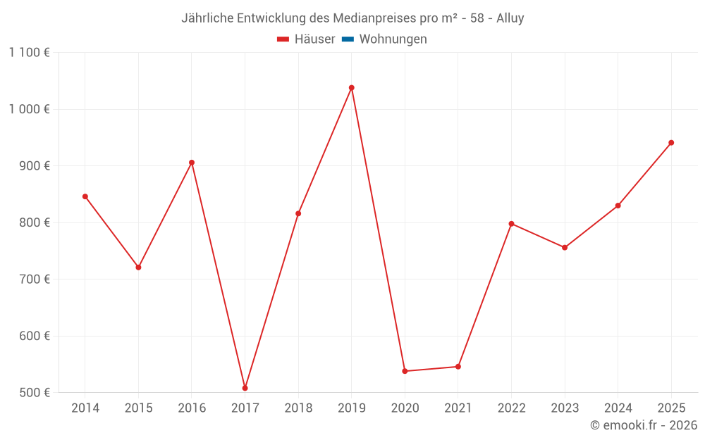 Der Durchschnittspreis auf den 16 Hausgeschäften der letzten 24 Monate in der Gemeinde Alluy betrug 790 € pro Quadratmeter für einen mittleren Immobilienwert von 60 250 €. Über diesen Zeitraum hinweg lagen 60% der Transaktionen zwischen 504 und 1 529 € pro Quadratmeter (vom 2. bis zum 8. Dezil).