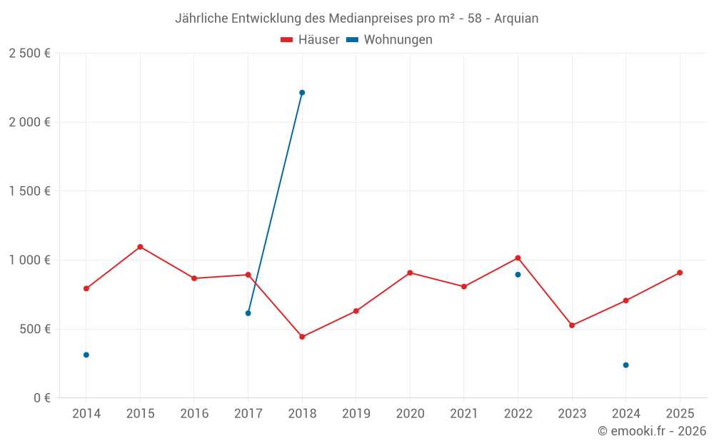 Der Durchschnittspreis auf den 25 Hausgeschäften der letzten 24 Monate in der Gemeinde Arquian betrug 690 € pro Quadratmeter für einen mittleren Immobilienwert von 66 000 €. Über diesen Zeitraum hinweg lagen 60% der Transaktionen zwischen 361 und 1 419 € pro Quadratmeter (vom 2. bis zum 8. Dezil).