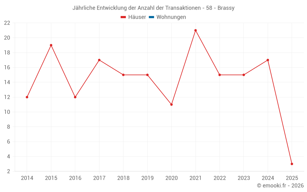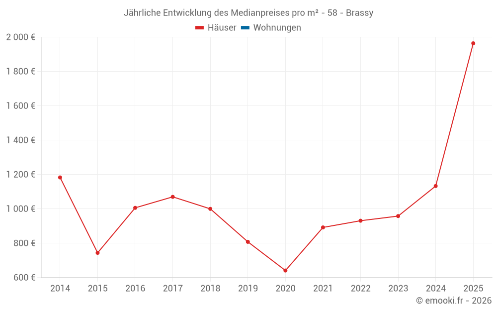 Der Durchschnittspreis auf den 26 Hausgeschäften der letzten 24 Monate in der Gemeinde Brassy betrug 1 122 € pro Quadratmeter für einen mittleren Immobilienwert von 81 000 €. Über diesen Zeitraum hinweg lagen 60% der Transaktionen zwischen 600 und 1 964 € pro Quadratmeter (vom 2. bis zum 8. Dezil).