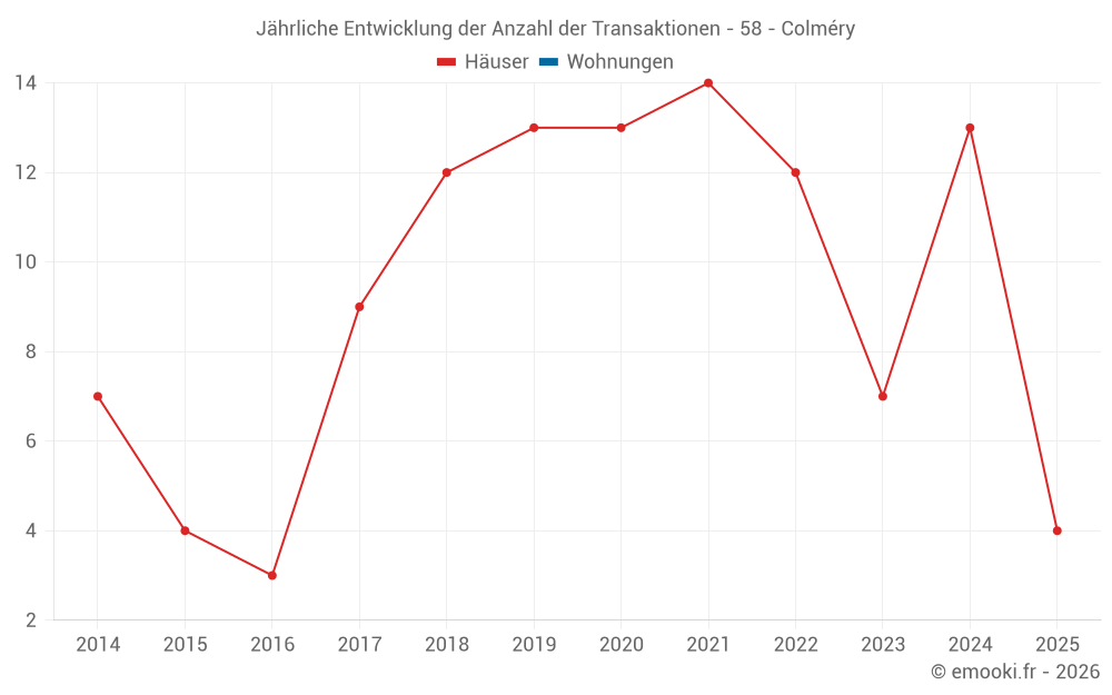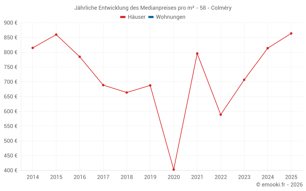 Der Durchschnittspreis auf den 21 Hausgeschäften der letzten 24 Monate in der Gemeinde Colméry betrug 814 € pro Quadratmeter für einen mittleren Immobilienwert von 95 000 €. Über diesen Zeitraum hinweg lagen 60% der Transaktionen zwischen 438 und 1 289 € pro Quadratmeter (vom 2. bis zum 8. Dezil).