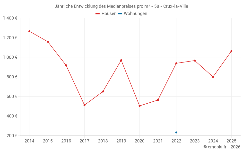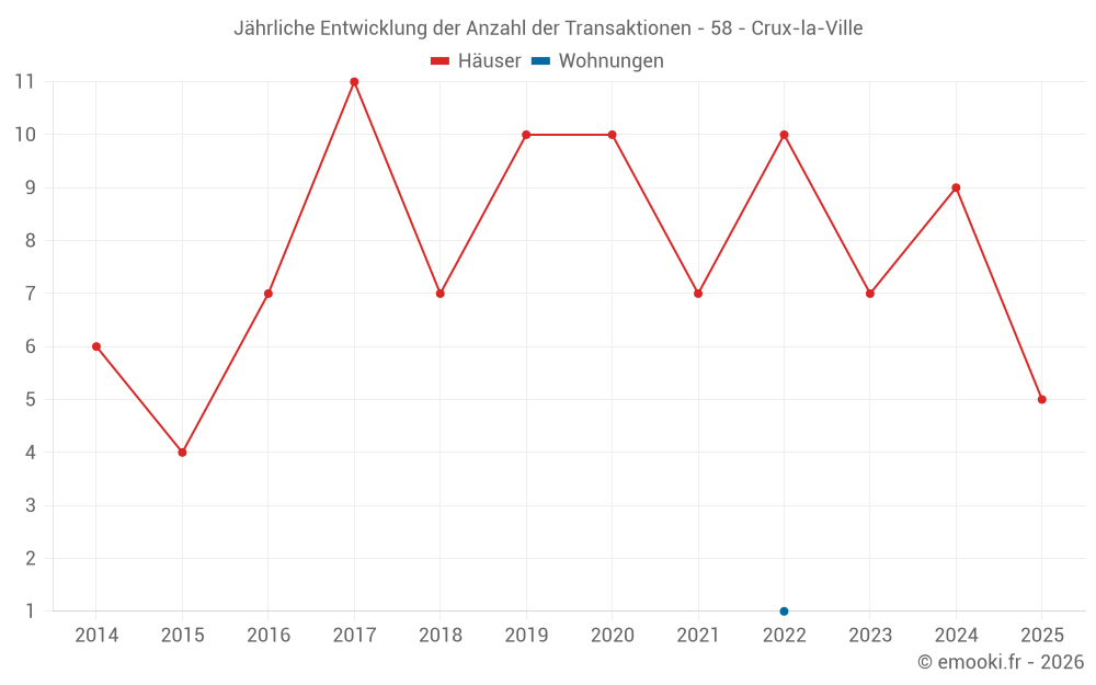 Der Durchschnittspreis auf den 19 Hausgeschäften der letzten 24 Monate in der Gemeinde Crux-la-Ville betrug 926 € pro Quadratmeter für einen mittleren Immobilienwert von 85 000 €. Über diesen Zeitraum hinweg lagen 60% der Transaktionen zwischen 460 und 1 462 € pro Quadratmeter (vom 2. bis zum 8. Dezil).