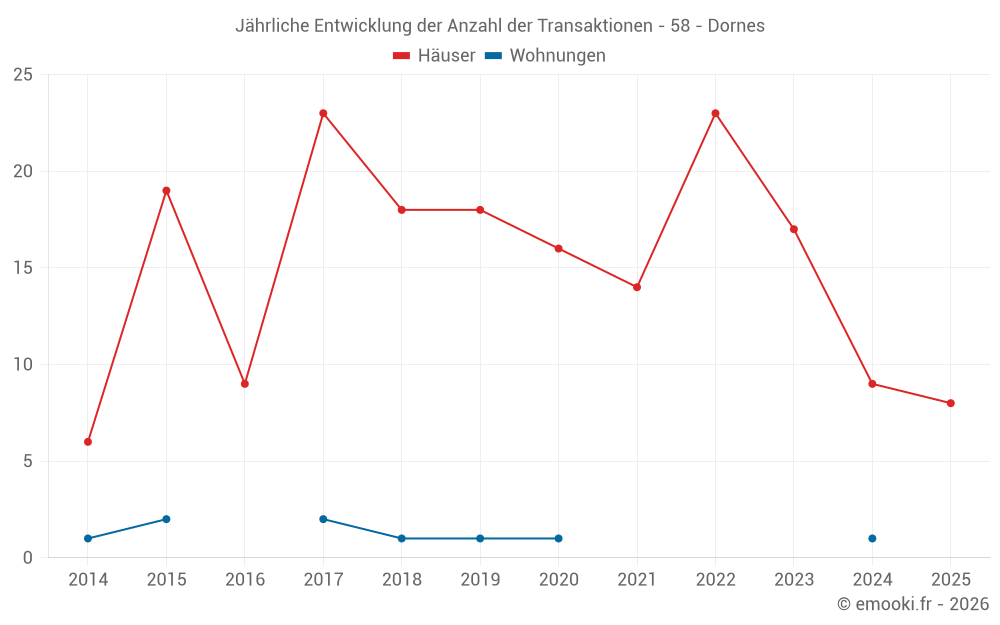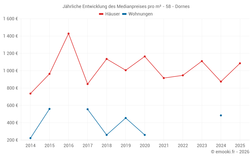 Der Durchschnittspreis auf den 30 Hausgeschäften der letzten 24 Monate in der Gemeinde Dornes betrug 1 080 € pro Quadratmeter für einen mittleren Immobilienwert von 100 000 €. Über diesen Zeitraum hinweg lagen 60% der Transaktionen zwischen 564 und 1 268 € pro Quadratmeter (vom 2. bis zum 8. Dezil).