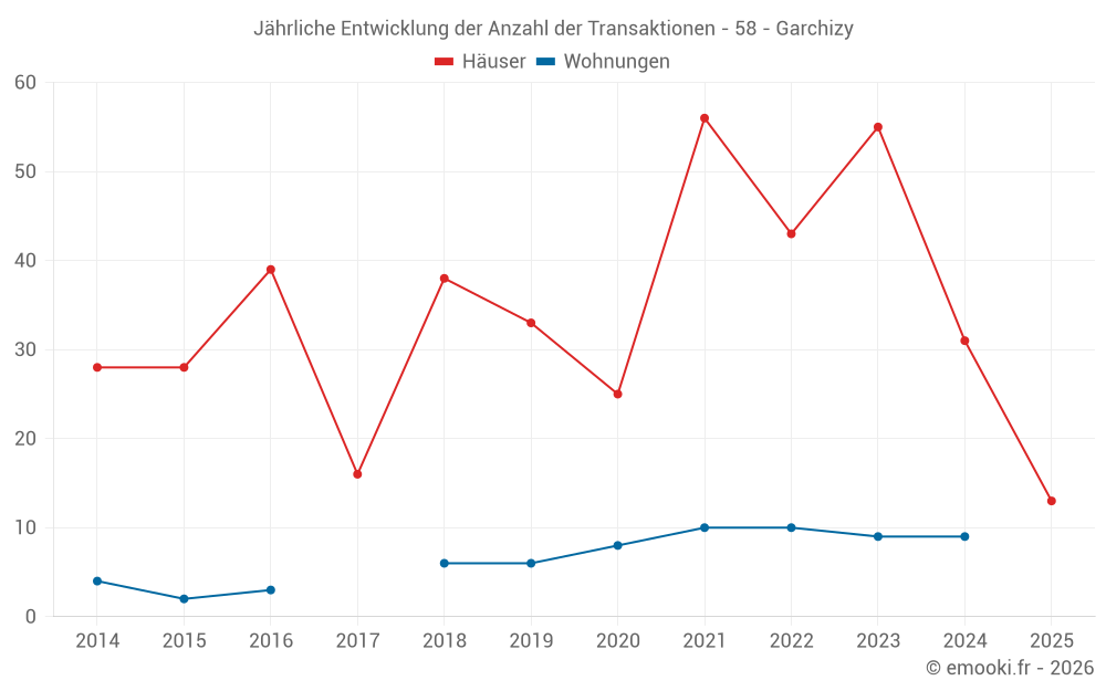 Der Durchschnittspreis auf den 33 Hausgeschäften der letzten 12 Monate in der Gemeinde Garchizy betrug 1 164 € pro Quadratmeter für einen mittleren Immobilienwert von 90 000 €. Über diesen Zeitraum hinweg lagen 60% der Transaktionen zwischen 919 und 1 654 € pro Quadratmeter (vom 2. bis zum 8. Dezil).