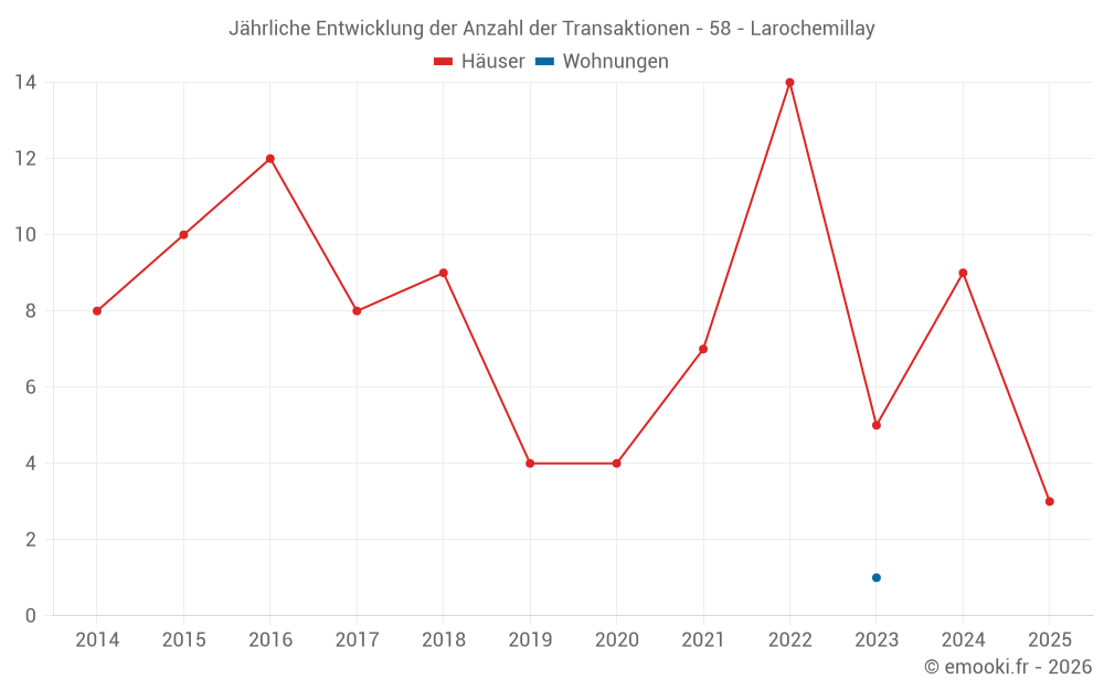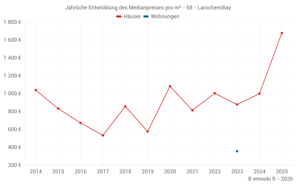Der Durchschnittspreis auf den 17 Hausgeschäften der letzten 24 Monate in der Gemeinde Larochemillay betrug 1 000 € pro Quadratmeter für einen mittleren Immobilienwert von 71 350 €. Über diesen Zeitraum hinweg lagen 60% der Transaktionen zwischen 805 und 1 695 € pro Quadratmeter (vom 2. bis zum 8. Dezil).