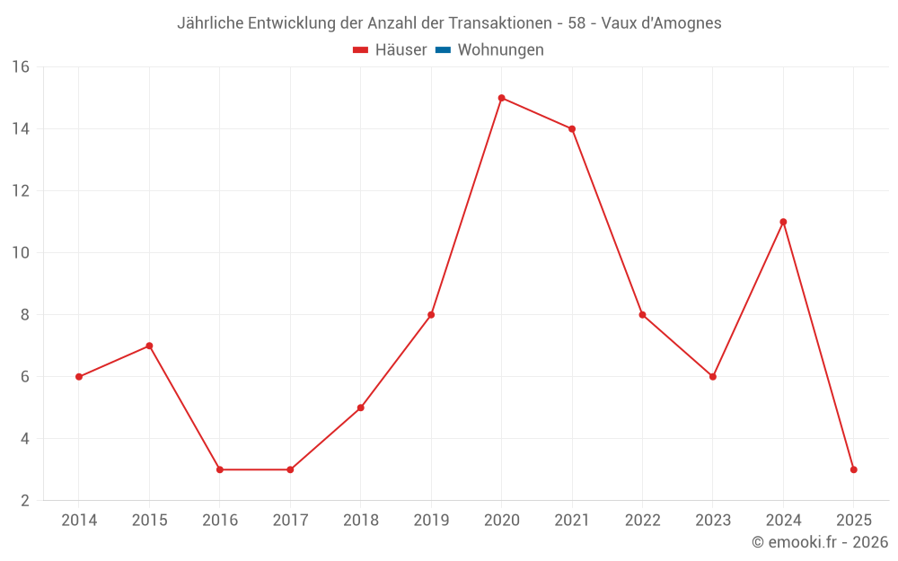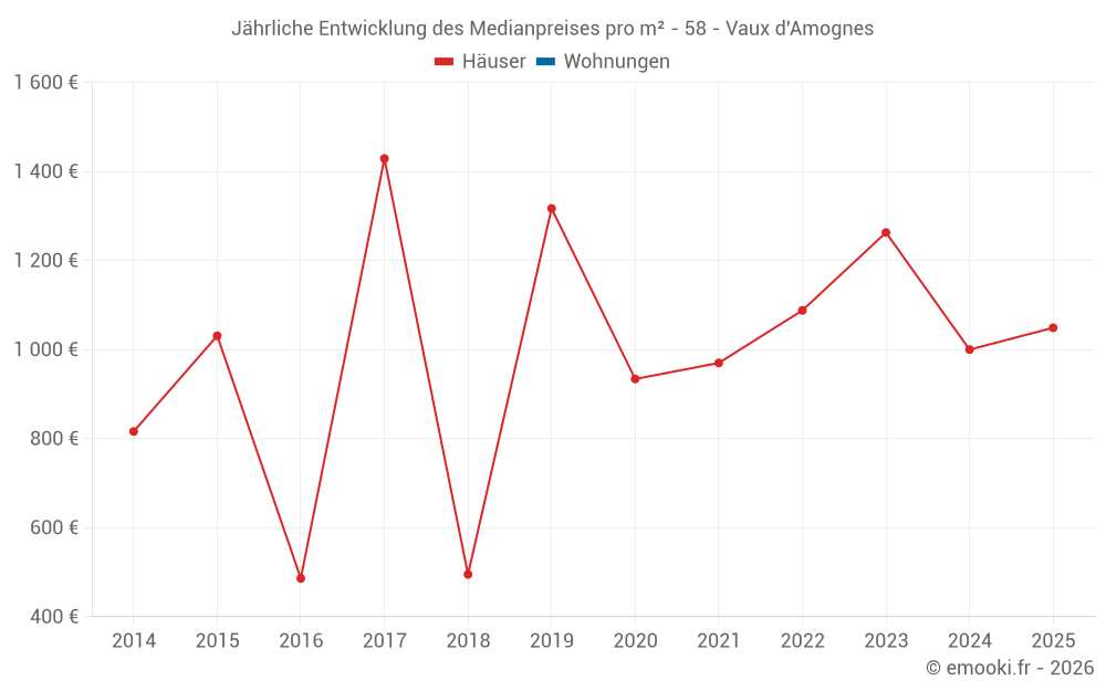 Der Durchschnittspreis auf den 17 Hausgeschäften der letzten 24 Monate in der Gemeinde Vaux d'Amognes betrug 1 049 € pro Quadratmeter für einen mittleren Immobilienwert von 98 000 €. Über diesen Zeitraum hinweg lagen 60% der Transaktionen zwischen 874 und 1 465 € pro Quadratmeter (vom 2. bis zum 8. Dezil).
