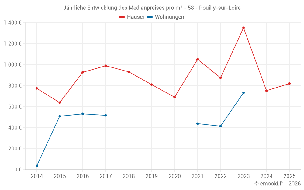 Der Durchschnittspreis auf den 30 Hausgeschäften der letzten 12 Monate in der Gemeinde Pouilly-sur-Loire betrug 786 € pro Quadratmeter für einen mittleren Immobilienwert von 58 000 €. Über diesen Zeitraum hinweg lagen 60% der Transaktionen zwischen 576 und 1 328 € pro Quadratmeter (vom 2. bis zum 8. Dezil).