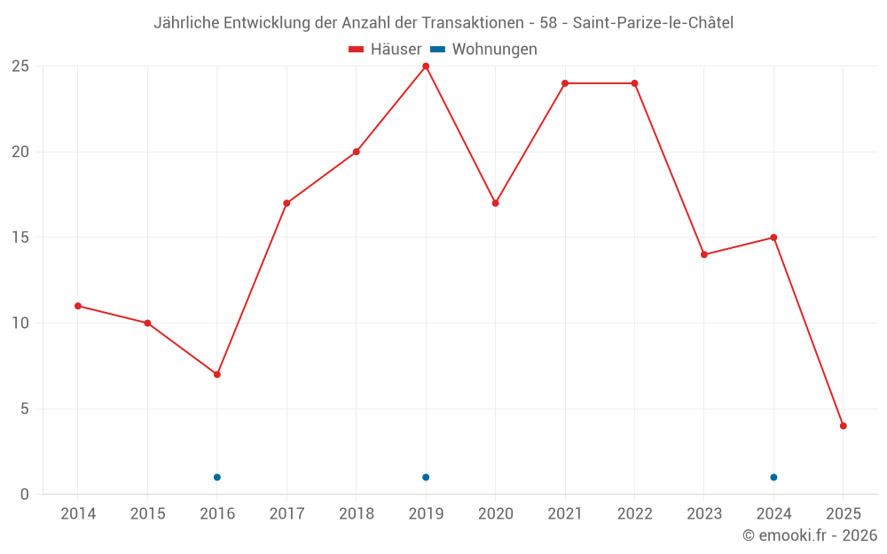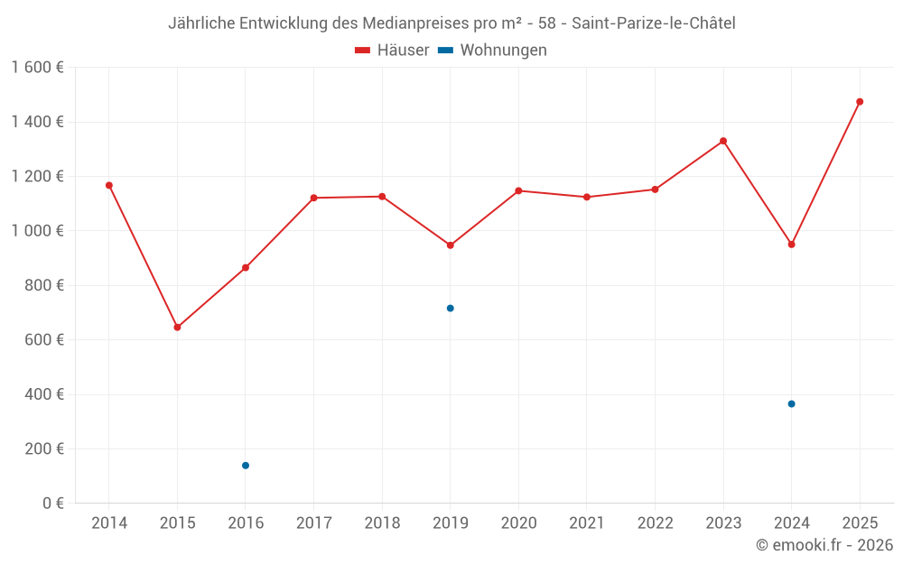 Der Durchschnittspreis auf den 24 Hausgeschäften der letzten 24 Monate in der Gemeinde Saint-Parize-le-Châtel betrug 1 141 € pro Quadratmeter für einen mittleren Immobilienwert von 106 600 €. Über diesen Zeitraum hinweg lagen 60% der Transaktionen zwischen 688 und 1 519 € pro Quadratmeter (vom 2. bis zum 8. Dezil).