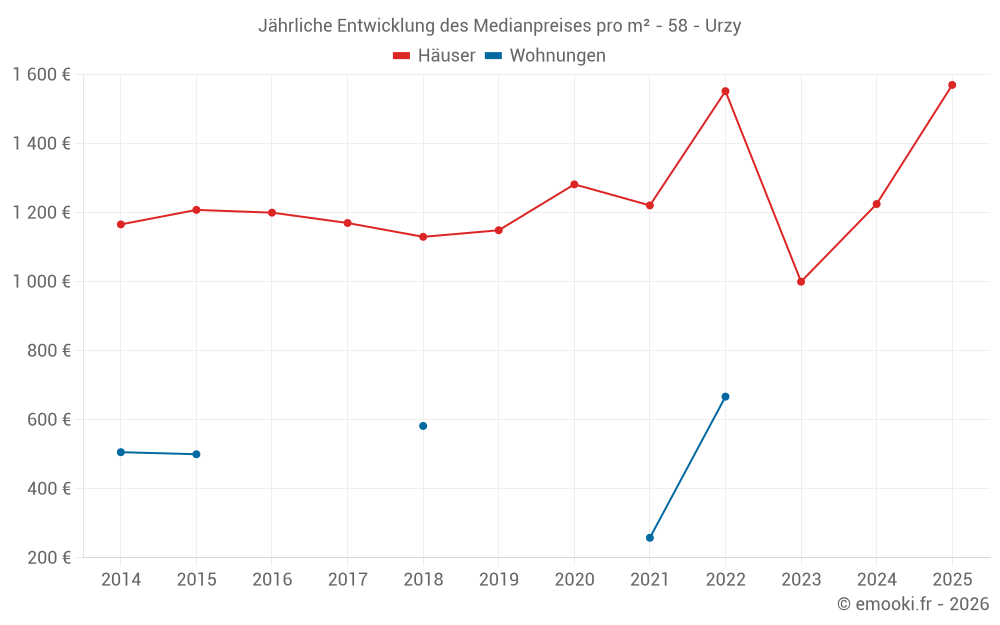 Der Durchschnittspreis auf den 25 Hausgeschäften der letzten 24 Monate in der Gemeinde Urzy betrug 1 277 € pro Quadratmeter für einen mittleren Immobilienwert von 120 000 €. Über diesen Zeitraum hinweg lagen 60% der Transaktionen zwischen 911 und 1 737 € pro Quadratmeter (vom 2. bis zum 8. Dezil).