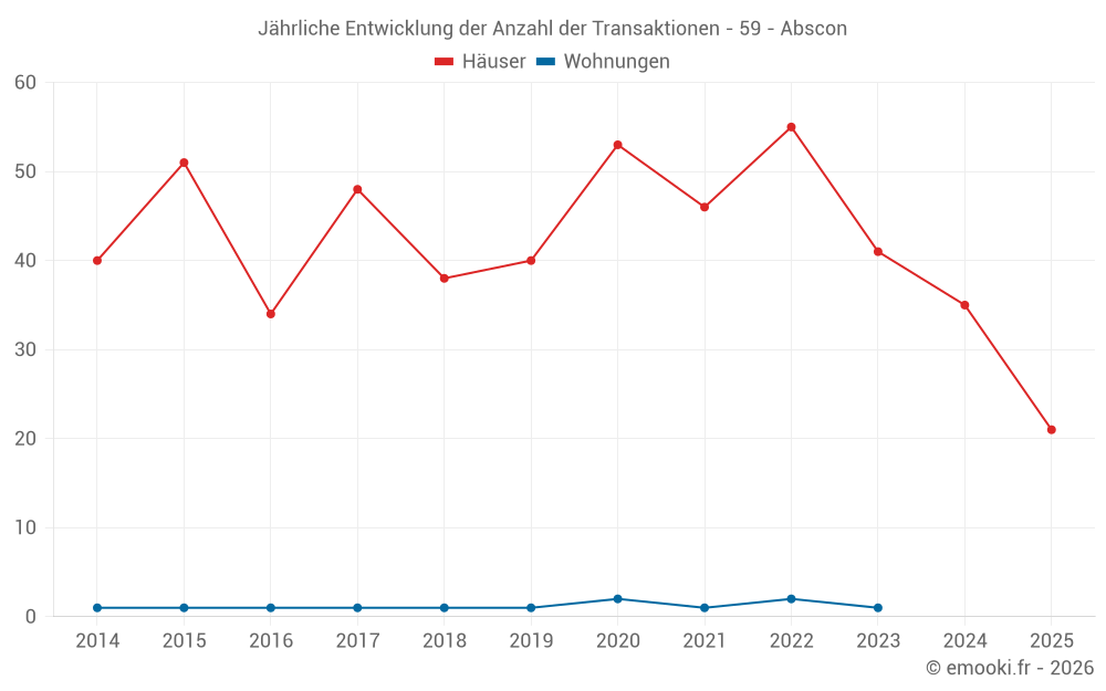 Der Durchschnittspreis auf den 21 Hausgeschäften der letzten 6 Monate in der Gemeinde Abscon betrug 1 346 € pro Quadratmeter für einen mittleren Immobilienwert von 150 600 €. Über diesen Zeitraum hinweg lagen 60% der Transaktionen zwischen 895 und 1 982 € pro Quadratmeter (vom 2. bis zum 8. Dezil).
