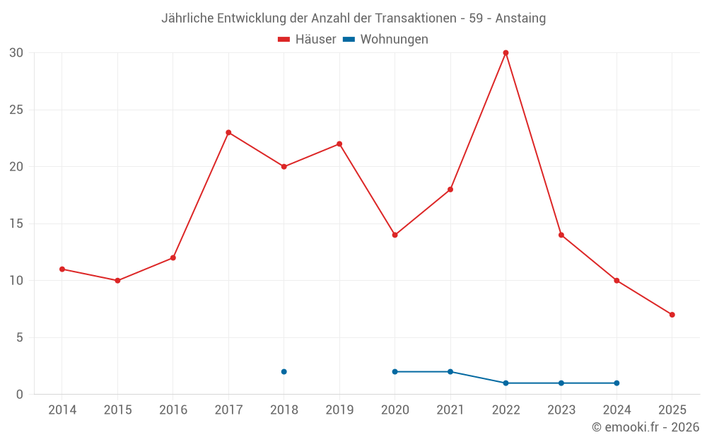 Der Durchschnittspreis auf den 25 Hausgeschäften der letzten 24 Monate in der Gemeinde Anstaing betrug 2 806 € pro Quadratmeter für einen mittleren Immobilienwert von 262 000 €. Über diesen Zeitraum hinweg lagen 60% der Transaktionen zwischen 2 408 und 3 893 € pro Quadratmeter (vom 2. bis zum 8. Dezil).