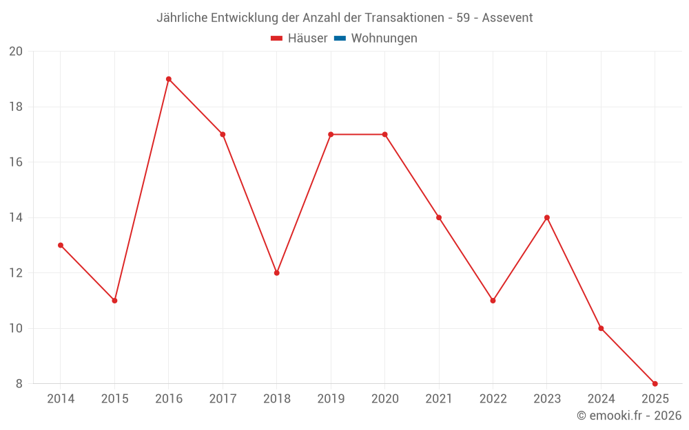 Der Durchschnittspreis auf den 17 Hausgeschäften der letzten 12 Monate in der Gemeinde Assevent betrug 1 476 € pro Quadratmeter für einen mittleren Immobilienwert von 140 000 €. Über diesen Zeitraum hinweg lagen 60% der Transaktionen zwischen 1 086 und 2 014 € pro Quadratmeter (vom 2. bis zum 8. Dezil).