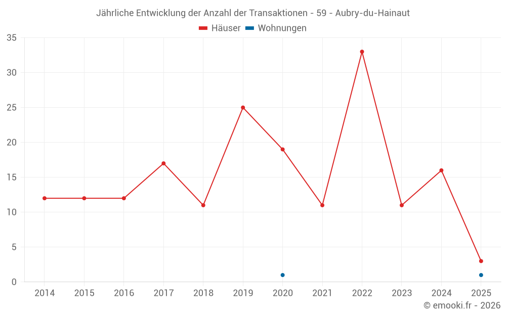 Der Durchschnittspreis auf den 23 Hausgeschäften der letzten 24 Monate in der Gemeinde Aubry-du-Hainaut betrug 1 796 € pro Quadratmeter für einen mittleren Immobilienwert von 203 000 €. Über diesen Zeitraum hinweg lagen 60% der Transaktionen zwischen 1 548 und 2 301 € pro Quadratmeter (vom 2. bis zum 8. Dezil).