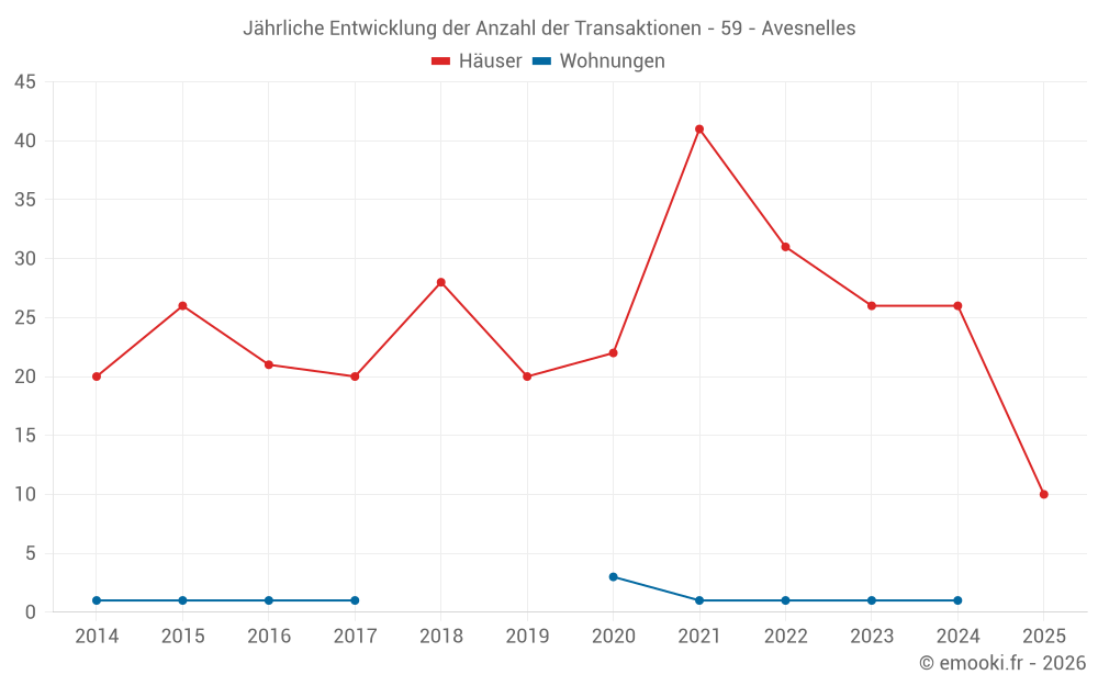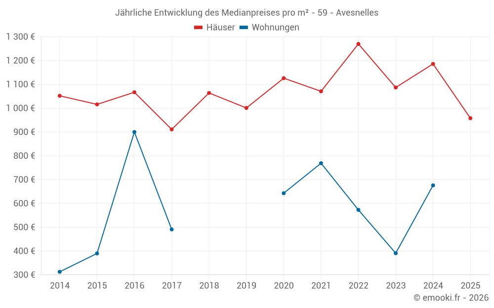 Der Durchschnittspreis auf den 26 Hausgeschäften der letzten 12 Monate in der Gemeinde Avesnelles betrug 1 130 € pro Quadratmeter für einen mittleren Immobilienwert von 112 000 €. Über diesen Zeitraum hinweg lagen 60% der Transaktionen zwischen 814 und 1 424 € pro Quadratmeter (vom 2. bis zum 8. Dezil).