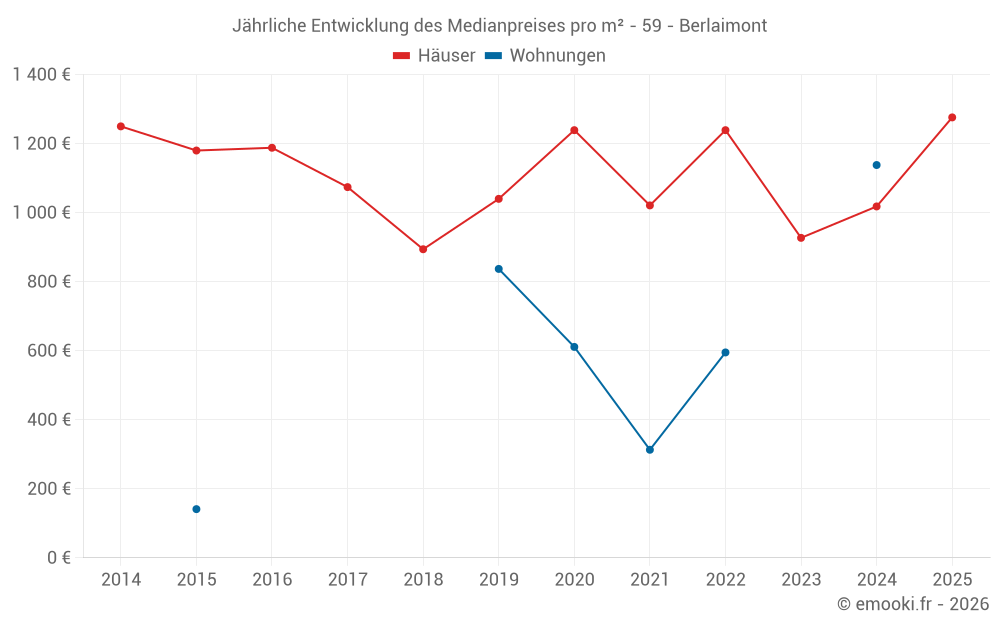 Der Durchschnittspreis auf den 30 Hausgeschäften der letzten 12 Monate in der Gemeinde Berlaimont betrug 1 169 € pro Quadratmeter für einen mittleren Immobilienwert von 115 000 €. Über diesen Zeitraum hinweg lagen 60% der Transaktionen zwischen 542 und 1 674 € pro Quadratmeter (vom 2. bis zum 8. Dezil).
