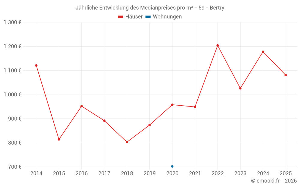 Der Durchschnittspreis auf den 23 Hausgeschäften der letzten 12 Monate in der Gemeinde Bertry betrug 1 185 € pro Quadratmeter für einen mittleren Immobilienwert von 139 000 €. Über diesen Zeitraum hinweg lagen 60% der Transaktionen zwischen 995 und 1 325 € pro Quadratmeter (vom 2. bis zum 8. Dezil).