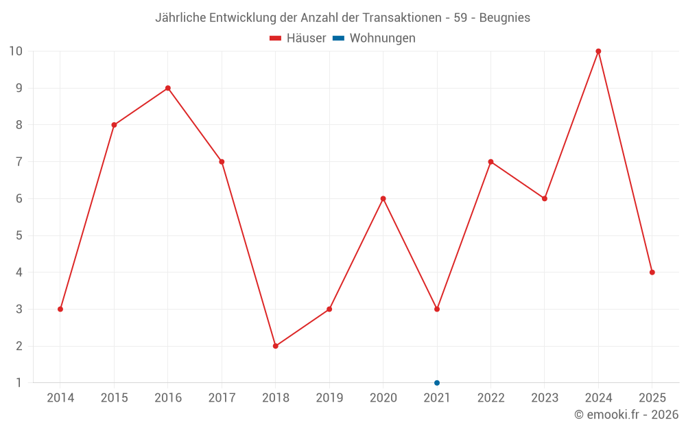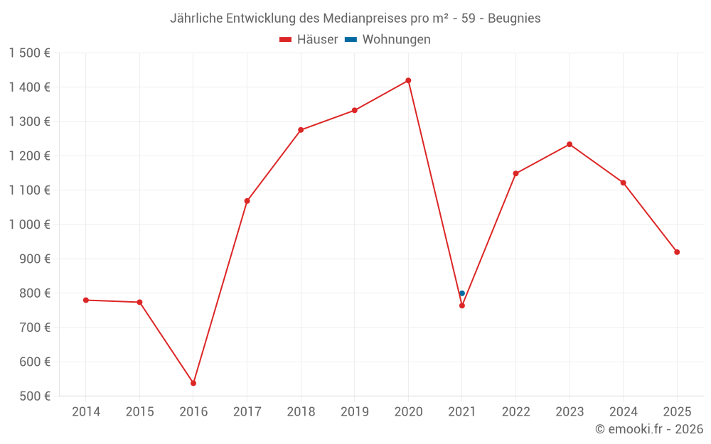 Der Durchschnittspreis auf den 19 Hausgeschäften der letzten 24 Monate in der Gemeinde Beugnies betrug 1 101 € pro Quadratmeter für einen mittleren Immobilienwert von 146 500 €. Über diesen Zeitraum hinweg lagen 60% der Transaktionen zwischen 770 und 1 580 € pro Quadratmeter (vom 2. bis zum 8. Dezil).