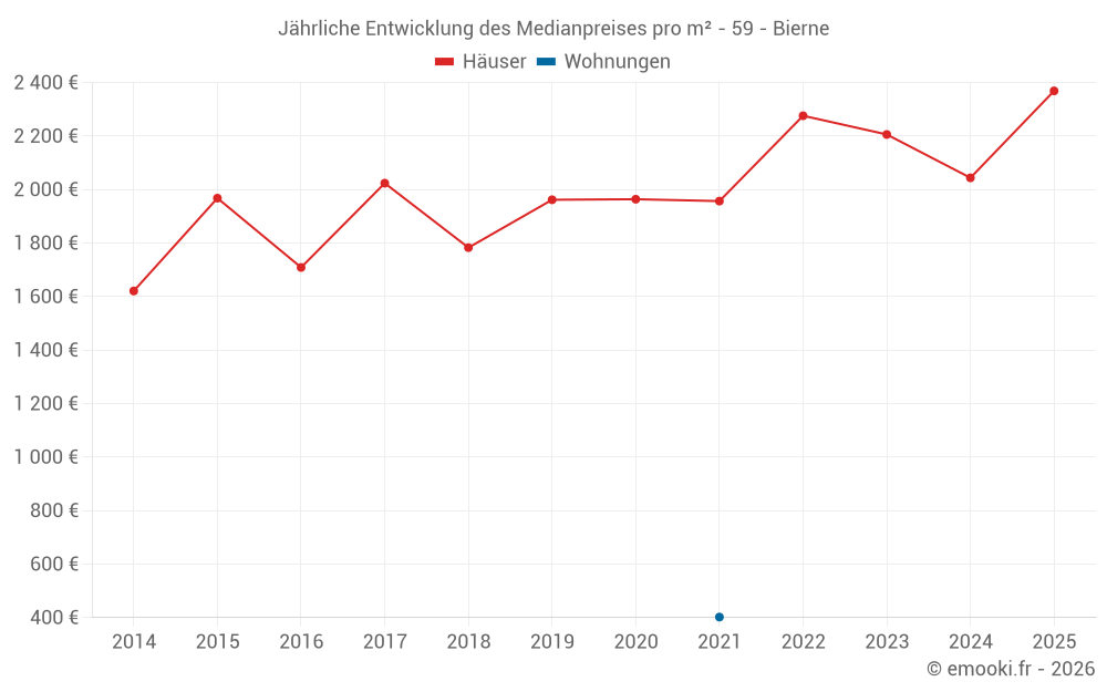 Der Durchschnittspreis auf den 20 Hausgeschäften der letzten 12 Monate in der Gemeinde Bierne betrug 2 124 € pro Quadratmeter für einen mittleren Immobilienwert von 227 500 €. Über diesen Zeitraum hinweg lagen 60% der Transaktionen zwischen 1 858 und 2 481 € pro Quadratmeter (vom 2. bis zum 8. Dezil).