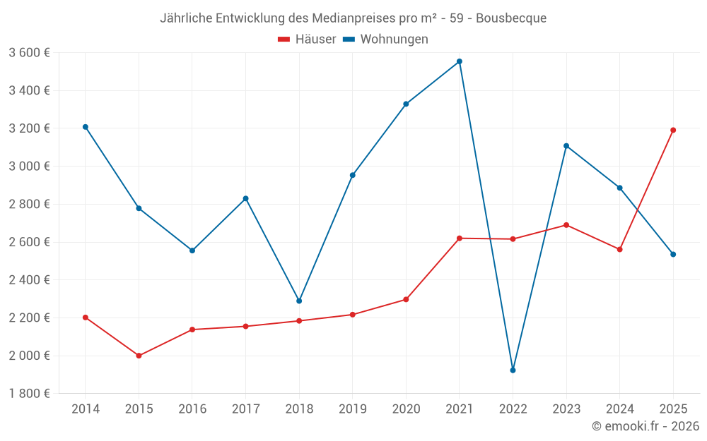 Der Durchschnittspreis auf den 19 Wohnungstransaktionen der letzten 24 Monate in der Gemeinde Bousbecque betrug 3 036 € pro Quadratmeter für einen mittleren Immobilienwert von 155 000 €. Über diesen Zeitraum hinweg lagen 60% der Transaktionen zwischen 2 349 und 3 231 € pro Quadratmeter (vom 2. bis zum 8. Dezil).
