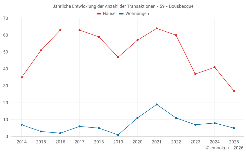 Der Durchschnittspreis auf den 27 Hausgeschäften der letzten 6 Monate in der Gemeinde Bousbecque betrug 3 191 € pro Quadratmeter für einen mittleren Immobilienwert von 340 000 €. Über diesen Zeitraum hinweg lagen 60% der Transaktionen zwischen 2 174 und 3 577 € pro Quadratmeter (vom 2. bis zum 8. Dezil).
