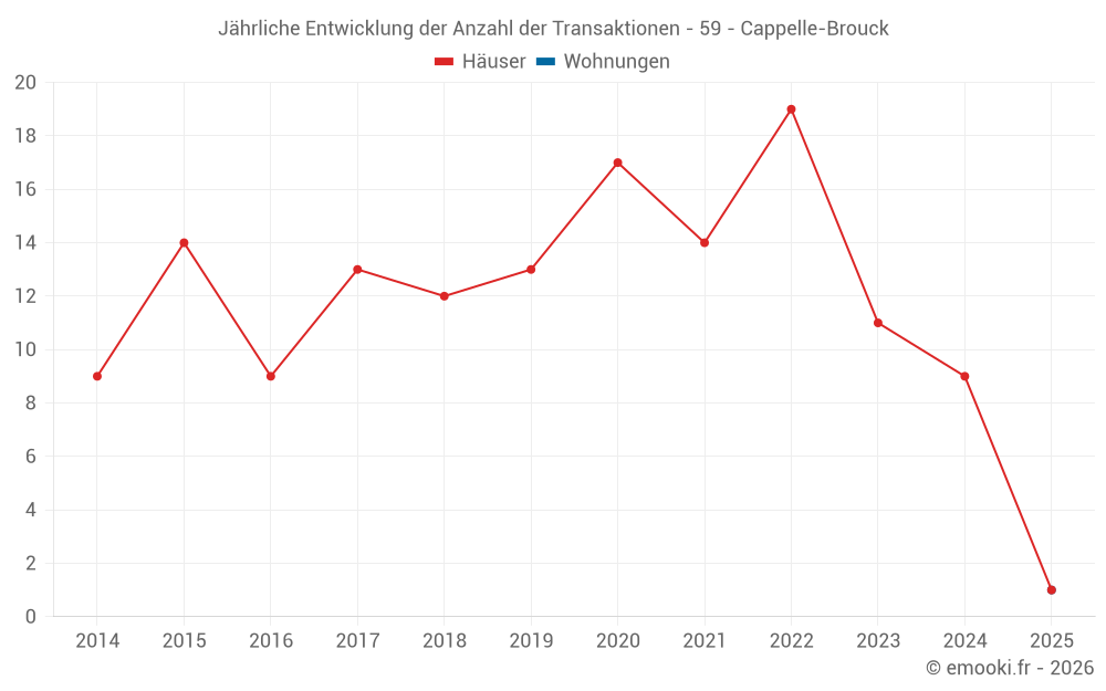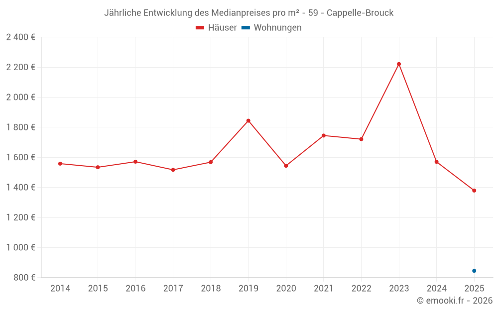 Der Durchschnittspreis auf den 15 Hausgeschäften der letzten 24 Monate in der Gemeinde Cappelle-Brouck betrug 1 934 € pro Quadratmeter für einen mittleren Immobilienwert von 180 000 €. Über diesen Zeitraum hinweg lagen 60% der Transaktionen zwischen 1 343 und 2 223 € pro Quadratmeter (vom 2. bis zum 8. Dezil).