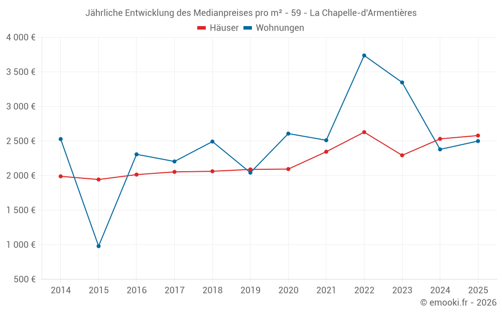 Der Durchschnittspreis auf den 17 Wohnungstransaktionen der letzten 12 Monate in der Gemeinde La Chapelle-d'Armentières betrug 2 380 € pro Quadratmeter für einen mittleren Immobilienwert von 129 000 €. Über diesen Zeitraum hinweg lagen 60% der Transaktionen zwischen 2 292 und 2 493 € pro Quadratmeter (vom 2. bis zum 8. Dezil).