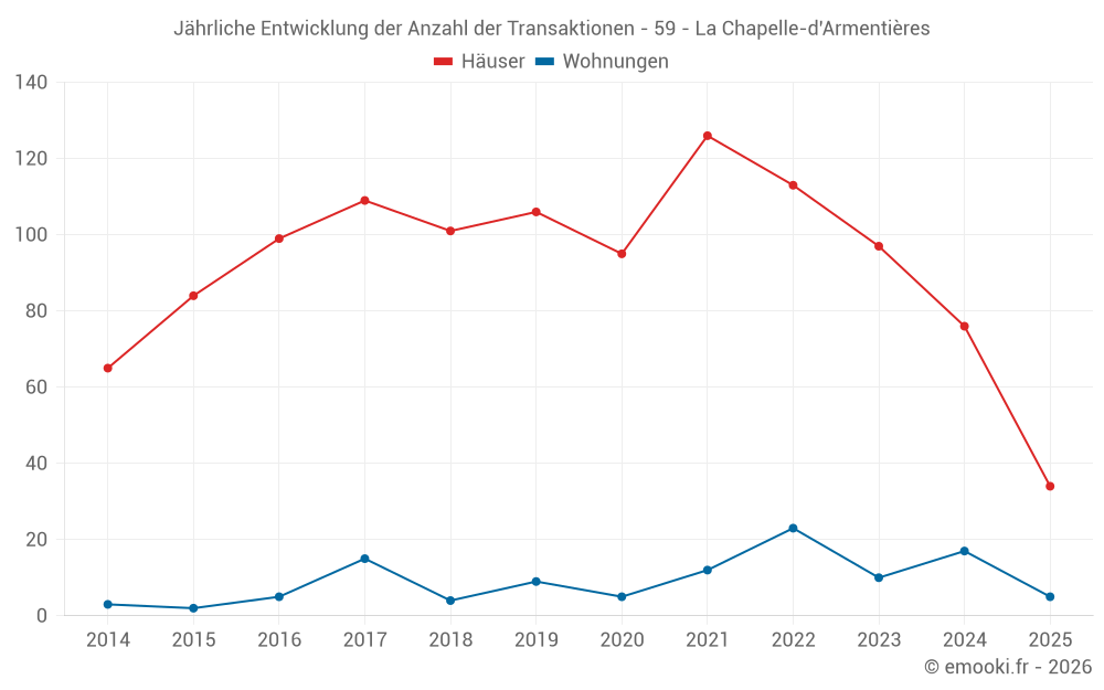 Der Durchschnittspreis auf den 34 Hausgeschäften der letzten 6 Monate in der Gemeinde La Chapelle-d'Armentières betrug 2 580 € pro Quadratmeter für einen mittleren Immobilienwert von 228 250 €. Über diesen Zeitraum hinweg lagen 60% der Transaktionen zwischen 2 029 und 2 921 € pro Quadratmeter (vom 2. bis zum 8. Dezil).