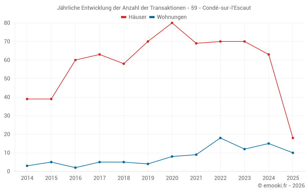 Der Durchschnittspreis auf den 18 Wohnungstransaktionen der letzten 12 Monate in der Gemeinde Condé-sur-l'Escaut betrug 1 280 € pro Quadratmeter für einen mittleren Immobilienwert von 65 000 €. Über diesen Zeitraum hinweg lagen 60% der Transaktionen zwischen 1 211 und 1 392 € pro Quadratmeter (vom 2. bis zum 8. Dezil).