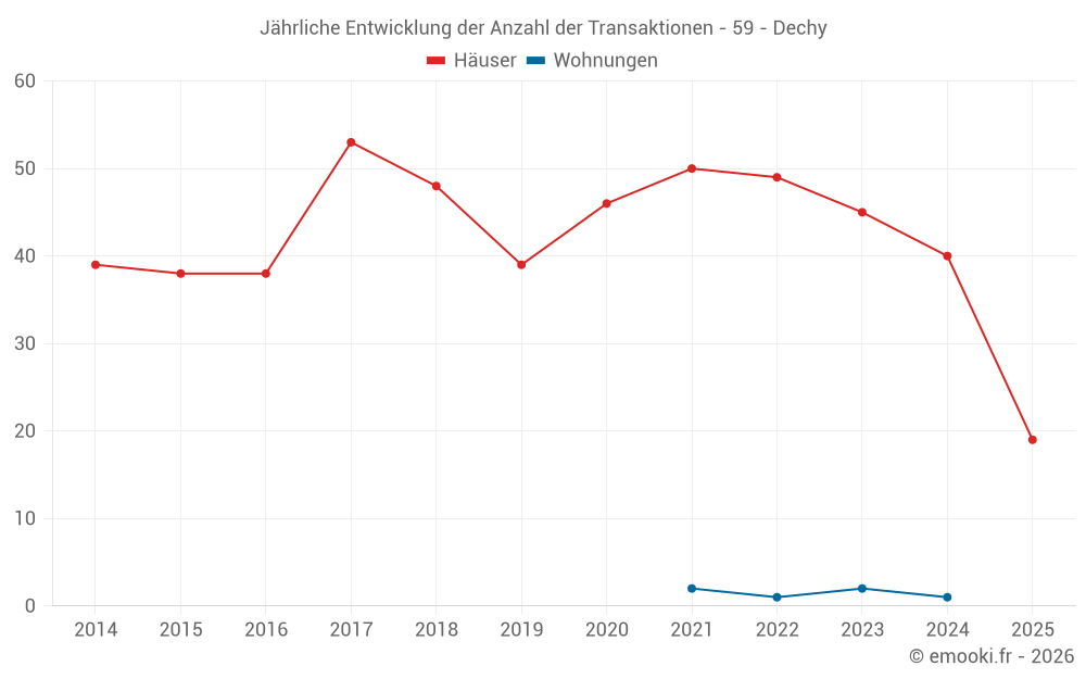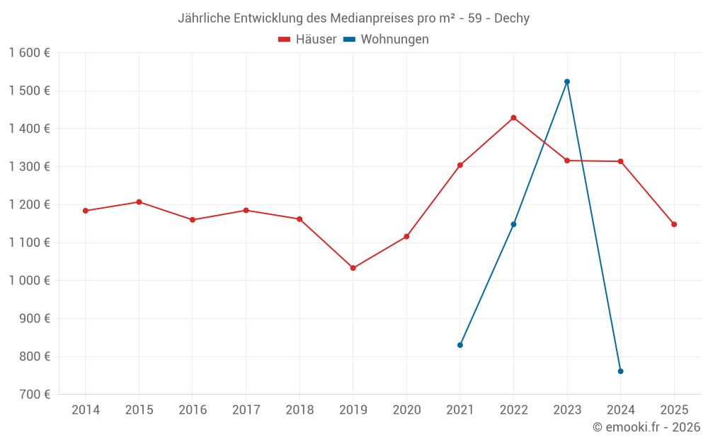 Der Durchschnittspreis auf den 19 Hausgeschäften der letzten 6 Monate in der Gemeinde Dechy betrug 1 148 € pro Quadratmeter für einen mittleren Immobilienwert von 100 000 €. Über diesen Zeitraum hinweg lagen 60% der Transaktionen zwischen 927 und 1 532 € pro Quadratmeter (vom 2. bis zum 8. Dezil).