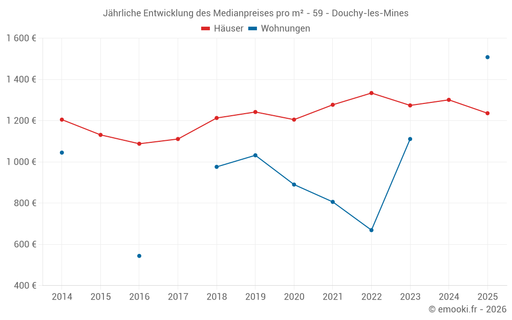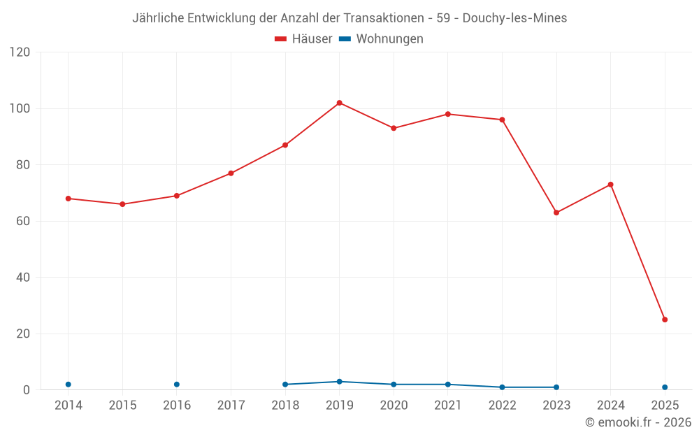 Der Durchschnittspreis auf den 25 Hausgeschäften der letzten 6 Monate in der Gemeinde Douchy-les-Mines betrug 1 236 € pro Quadratmeter für einen mittleren Immobilienwert von 112 100 €. Über diesen Zeitraum hinweg lagen 60% der Transaktionen zwischen 948 und 1 698 € pro Quadratmeter (vom 2. bis zum 8. Dezil).