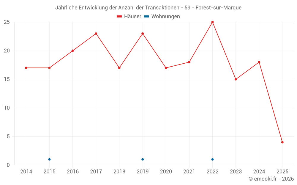 Der Durchschnittspreis auf den 29 Hausgeschäften der letzten 24 Monate in der Gemeinde Forest-sur-Marque betrug 3 142 € pro Quadratmeter für einen mittleren Immobilienwert von 299 500 €. Über diesen Zeitraum hinweg lagen 60% der Transaktionen zwischen 2 340 und 3 597 € pro Quadratmeter (vom 2. bis zum 8. Dezil).