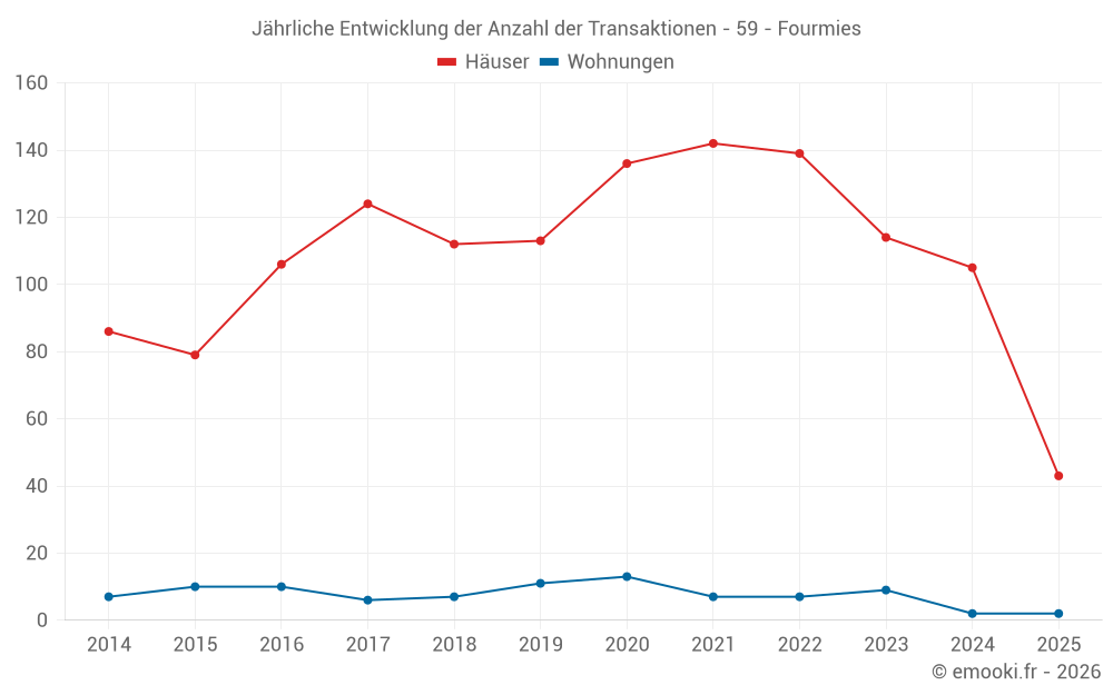 Der Durchschnittspreis auf den 43 Hausgeschäften der letzten 6 Monate in der Gemeinde Fourmies betrug 933 € pro Quadratmeter für einen mittleren Immobilienwert von 80 000 €. Über diesen Zeitraum hinweg lagen 60% der Transaktionen zwischen 457 und 1 194 € pro Quadratmeter (vom 2. bis zum 8. Dezil).