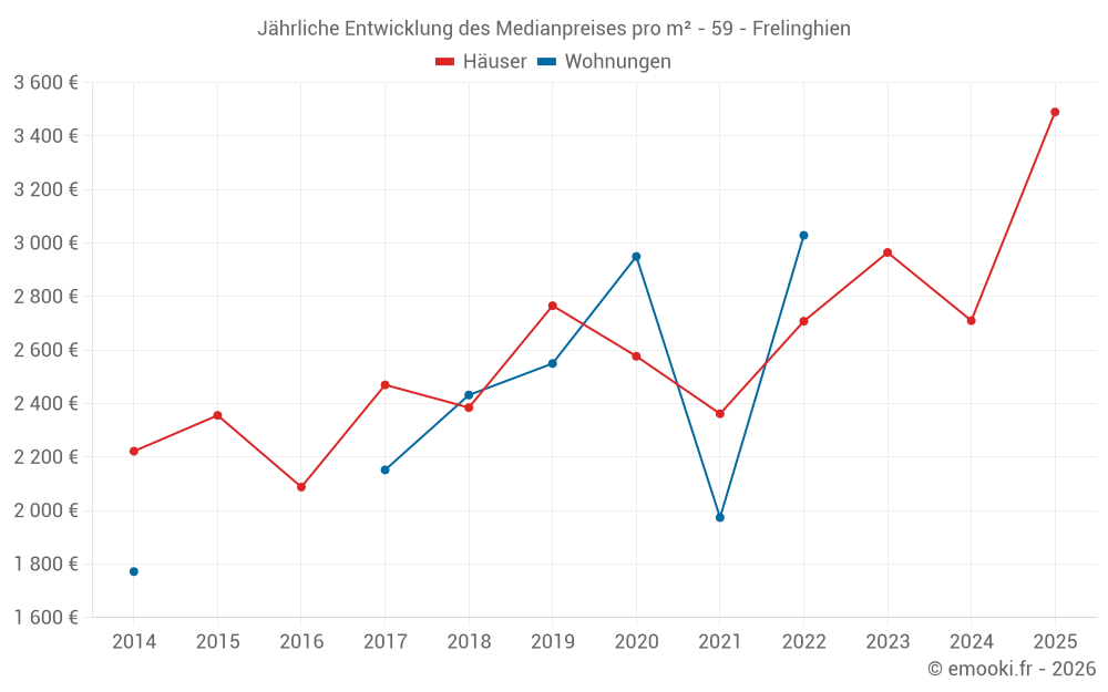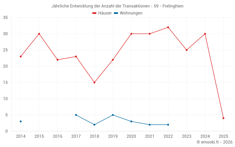 Der Durchschnittspreis auf den 22 Hausgeschäften der letzten 12 Monate in der Gemeinde Frelinghien betrug 2 872 € pro Quadratmeter für einen mittleren Immobilienwert von 288 000 €. Über diesen Zeitraum hinweg lagen 60% der Transaktionen zwischen 2 324 und 3 393 € pro Quadratmeter (vom 2. bis zum 8. Dezil).