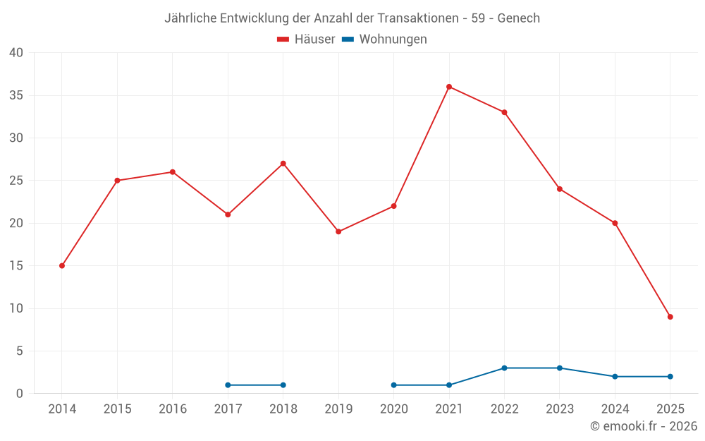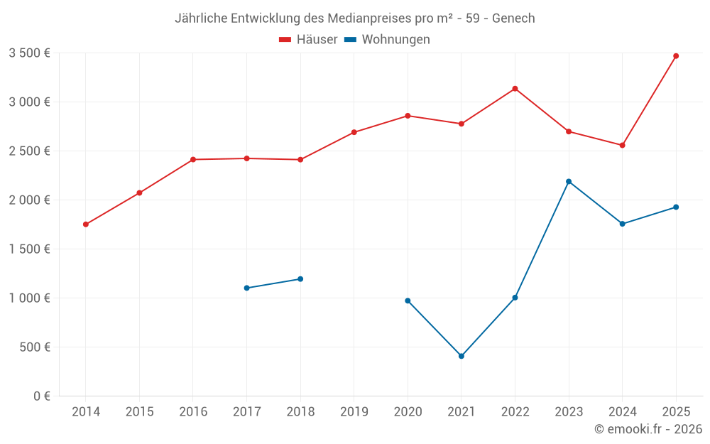 Der Durchschnittspreis auf den 20 Hausgeschäften der letzten 12 Monate in der Gemeinde Genech betrug 2 720 € pro Quadratmeter für einen mittleren Immobilienwert von 275 000 €. Über diesen Zeitraum hinweg lagen 60% der Transaktionen zwischen 2 100 und 3 954 € pro Quadratmeter (vom 2. bis zum 8. Dezil).