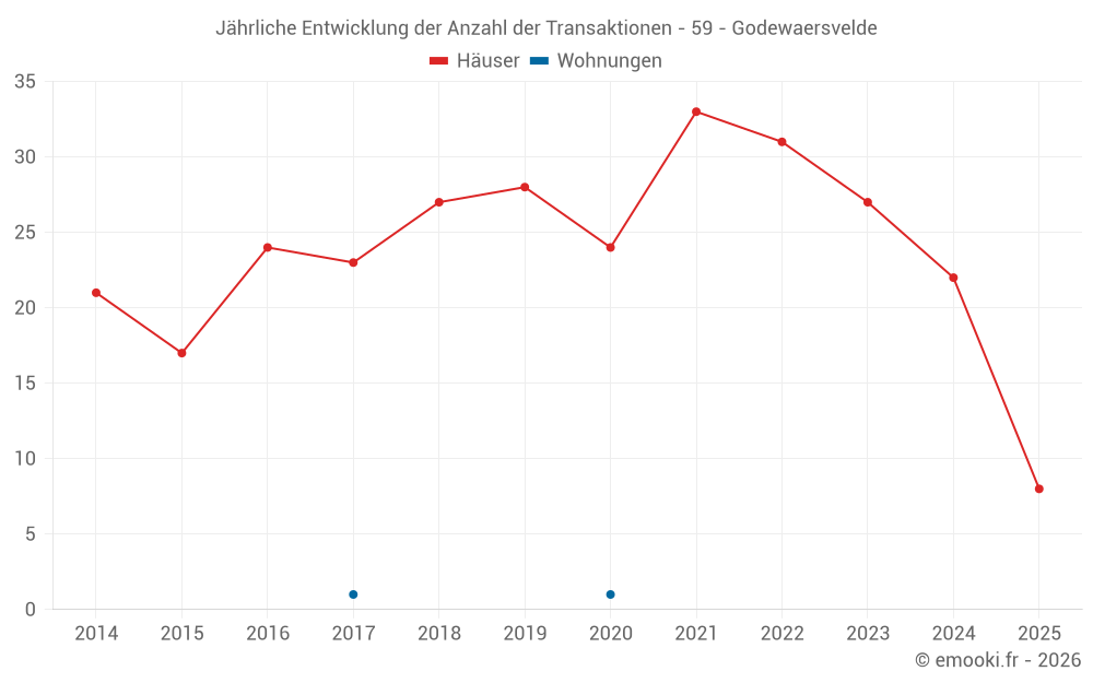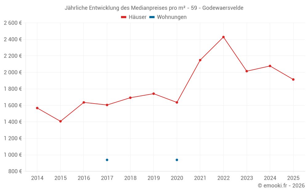 Der Durchschnittspreis auf den 19 Hausgeschäften der letzten 12 Monate in der Gemeinde Godewaersvelde betrug 2 059 € pro Quadratmeter für einen mittleren Immobilienwert von 199 000 €. Über diesen Zeitraum hinweg lagen 60% der Transaktionen zwischen 1 445 und 2 438 € pro Quadratmeter (vom 2. bis zum 8. Dezil).