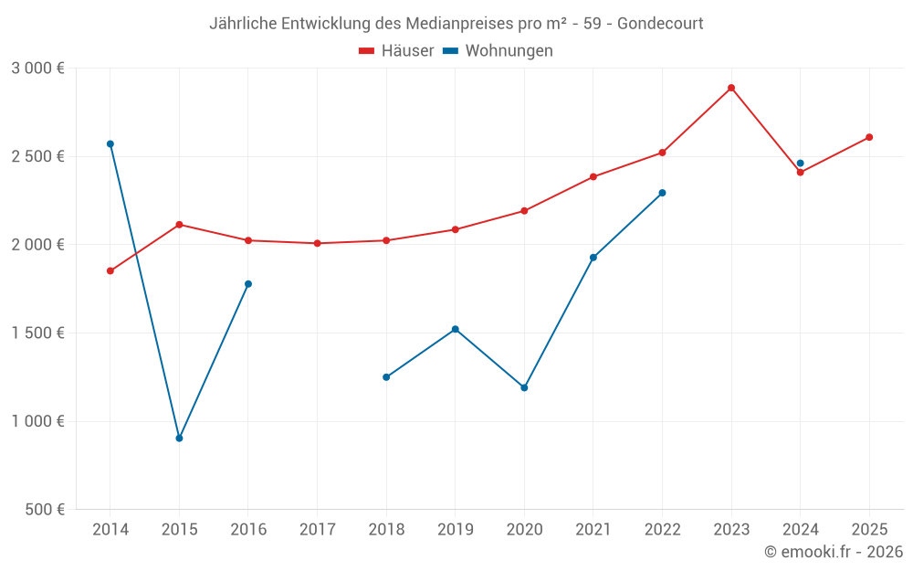Der Durchschnittspreis auf den 36 Hausgeschäften der letzten 12 Monate in der Gemeinde Gondecourt betrug 2 500 € pro Quadratmeter für einen mittleren Immobilienwert von 236 460 €. Über diesen Zeitraum hinweg lagen 60% der Transaktionen zwischen 1 719 und 2 914 € pro Quadratmeter (vom 2. bis zum 8. Dezil).