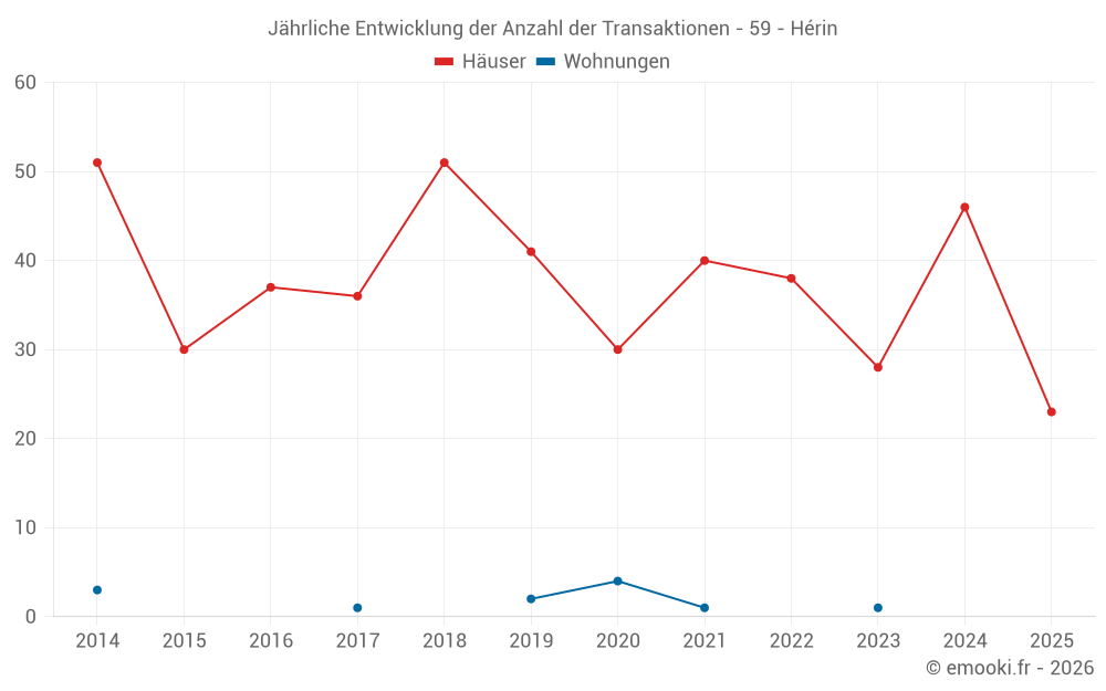 Der Durchschnittspreis auf den 23 Hausgeschäften der letzten 6 Monate in der Gemeinde Hérin betrug 1 624 € pro Quadratmeter für einen mittleren Immobilienwert von 140 380 €. Über diesen Zeitraum hinweg lagen 60% der Transaktionen zwischen 1 141 und 1 889 € pro Quadratmeter (vom 2. bis zum 8. Dezil).