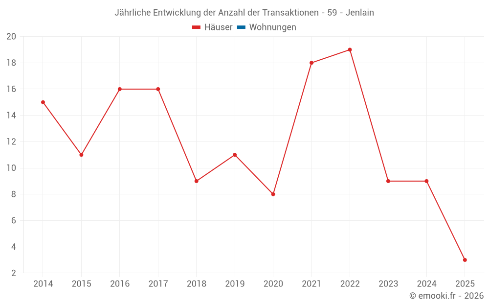 Der Durchschnittspreis auf den 15 Hausgeschäften der letzten 24 Monate in der Gemeinde Jenlain betrug 1 862 € pro Quadratmeter für einen mittleren Immobilienwert von 177 200 €. Über diesen Zeitraum hinweg lagen 60% der Transaktionen zwischen 1 158 und 2 248 € pro Quadratmeter (vom 2. bis zum 8. Dezil).