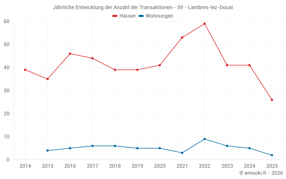 Der Durchschnittspreis auf den 26 Hausgeschäften der letzten 6 Monate in der Gemeinde Lambres-lez-Douai betrug 1 544 € pro Quadratmeter für einen mittleren Immobilienwert von 138 505 €. Über diesen Zeitraum hinweg lagen 60% der Transaktionen zwischen 1 281 und 2 059 € pro Quadratmeter (vom 2. bis zum 8. Dezil).
